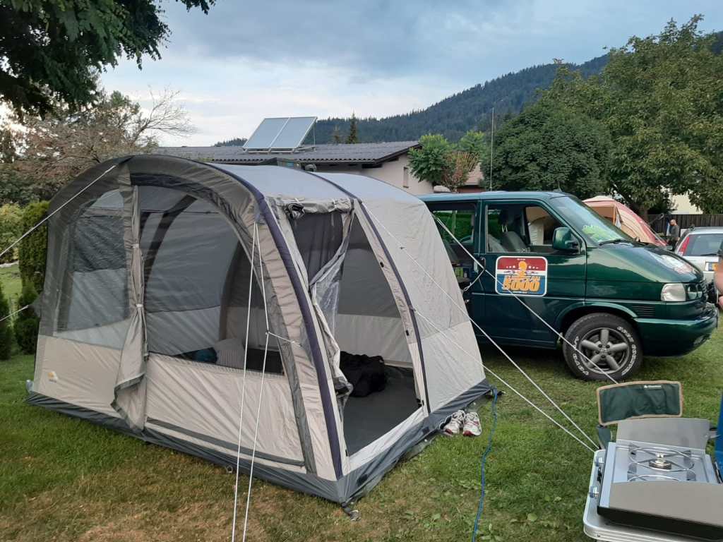 Jetzt war es an der Zeit, einen Übernachtungsplatz zu suchen, gar nicht so einfach. Der erste Campingplatz war ausgebucht, aber beim zweiten Campingplatz hat es dann geklappt. Unser „Renn-Frosch“ kam gut an, denn mehrere Menschen sind auf uns zugekommen und haben nachgefragt, was wir da so treiben mit unserem T4.