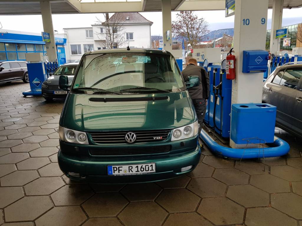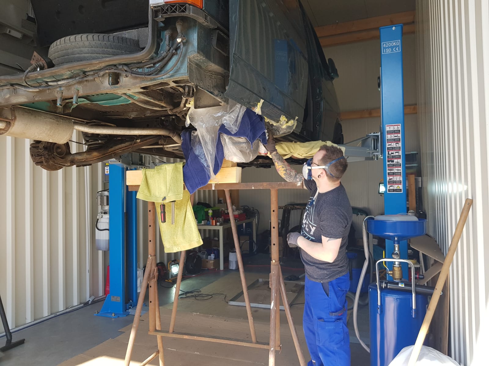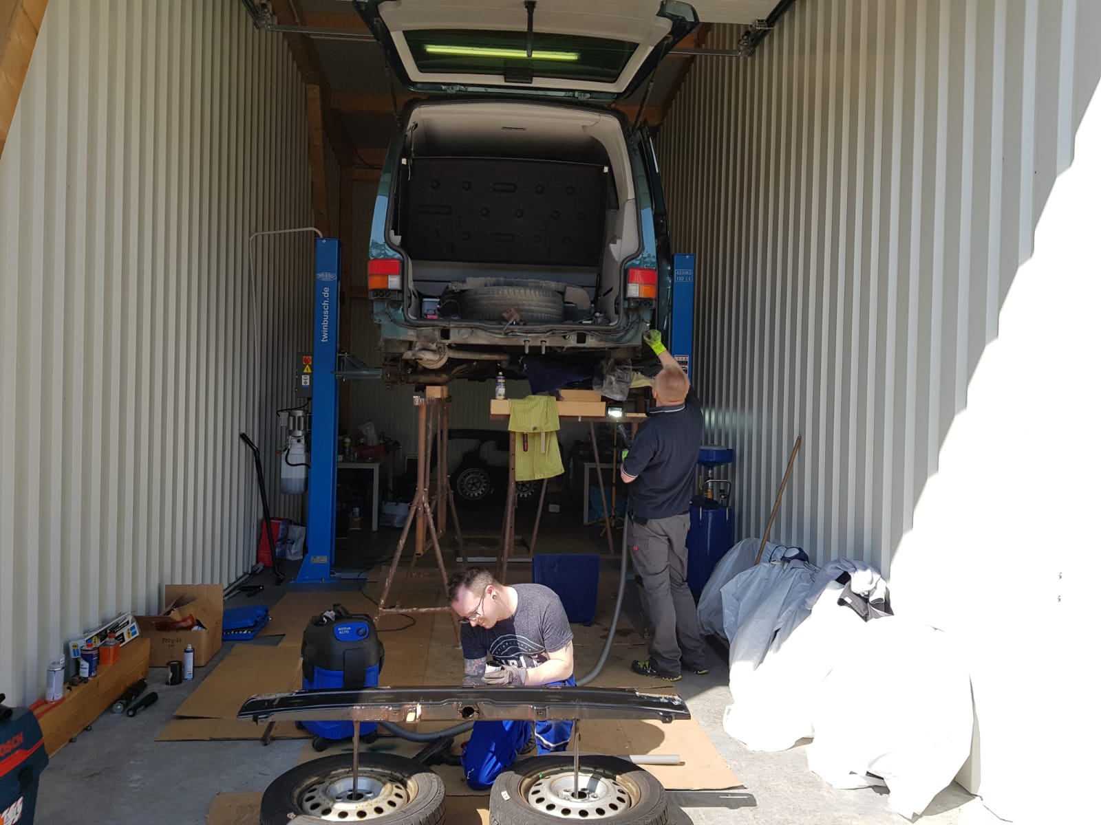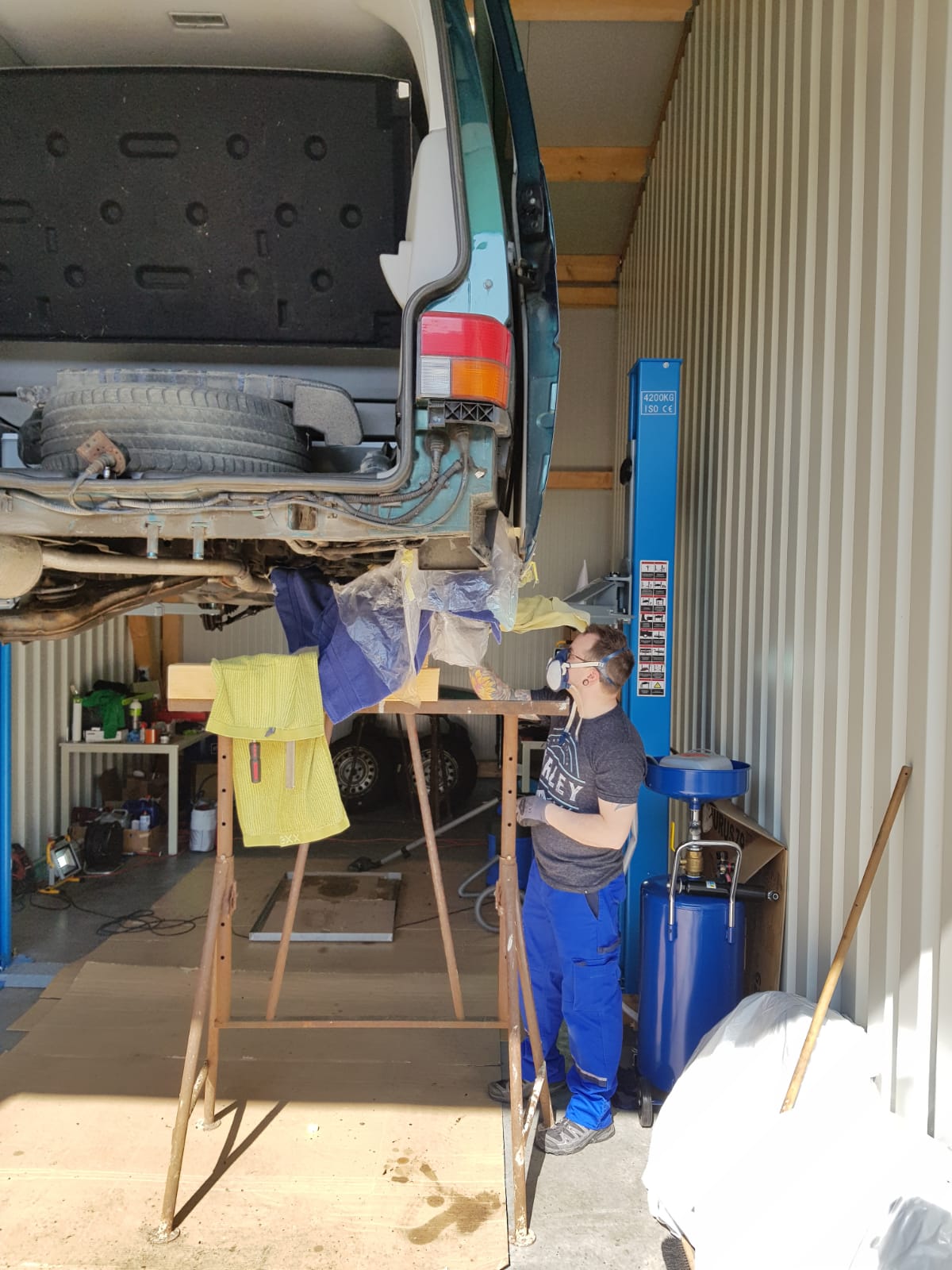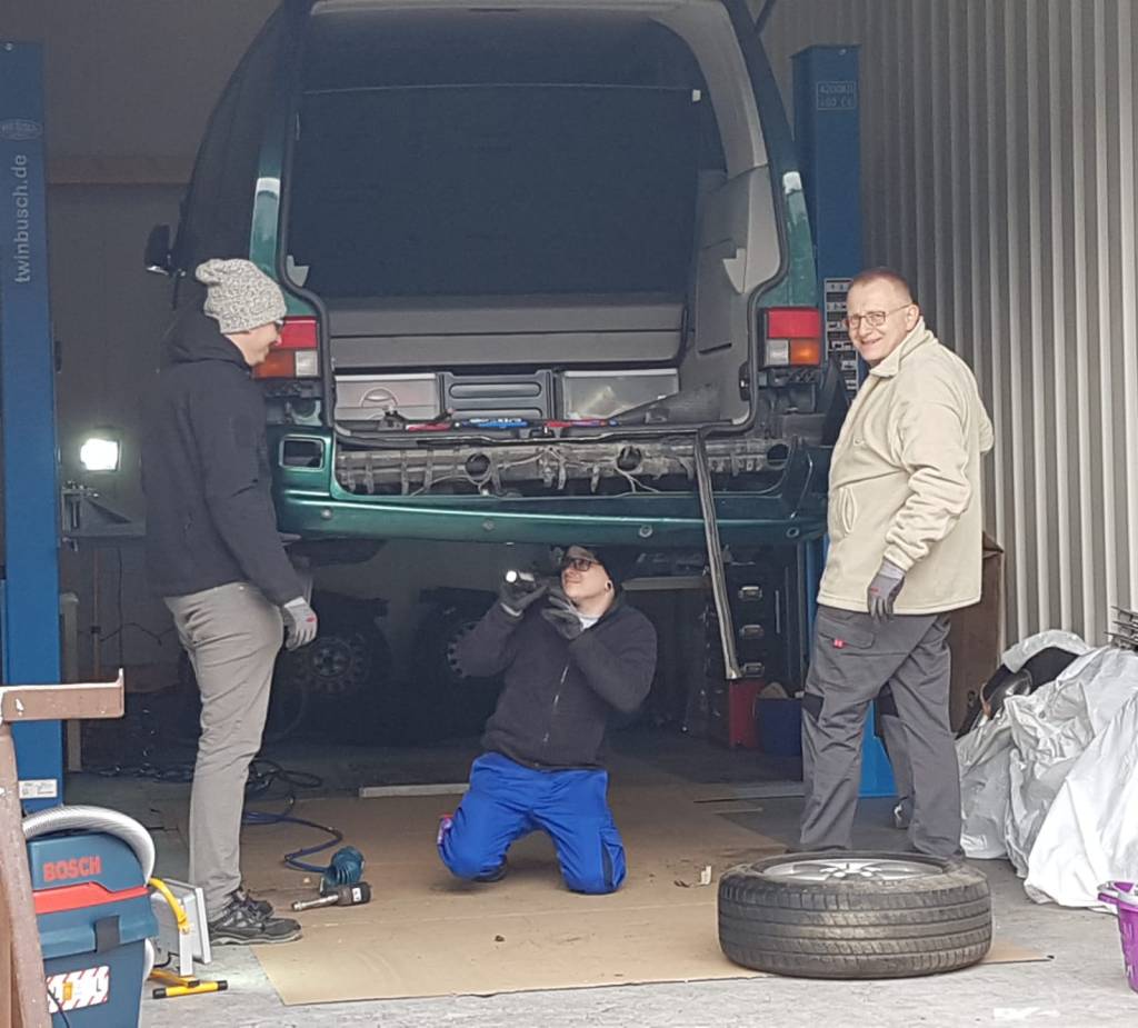 Die eigene Werkstatt von Matthias eignet sich hervorragend zum Schrauben. Dort ging es unserem T4 das erste mal am 02.02.2019 an den Kragen 😉 . Ab auf die Hebebühne… An diesem Tag haben wir die Reifen demontiert, Heckstoßstange entfernt und eine erste genaue Bestandsaufnahme durchgeführt. Wir stellten fest, dass jeden Menge Arbeit auf uns wartet, um den „Renn-Frosch“ Rallye-tauglich zu machen.